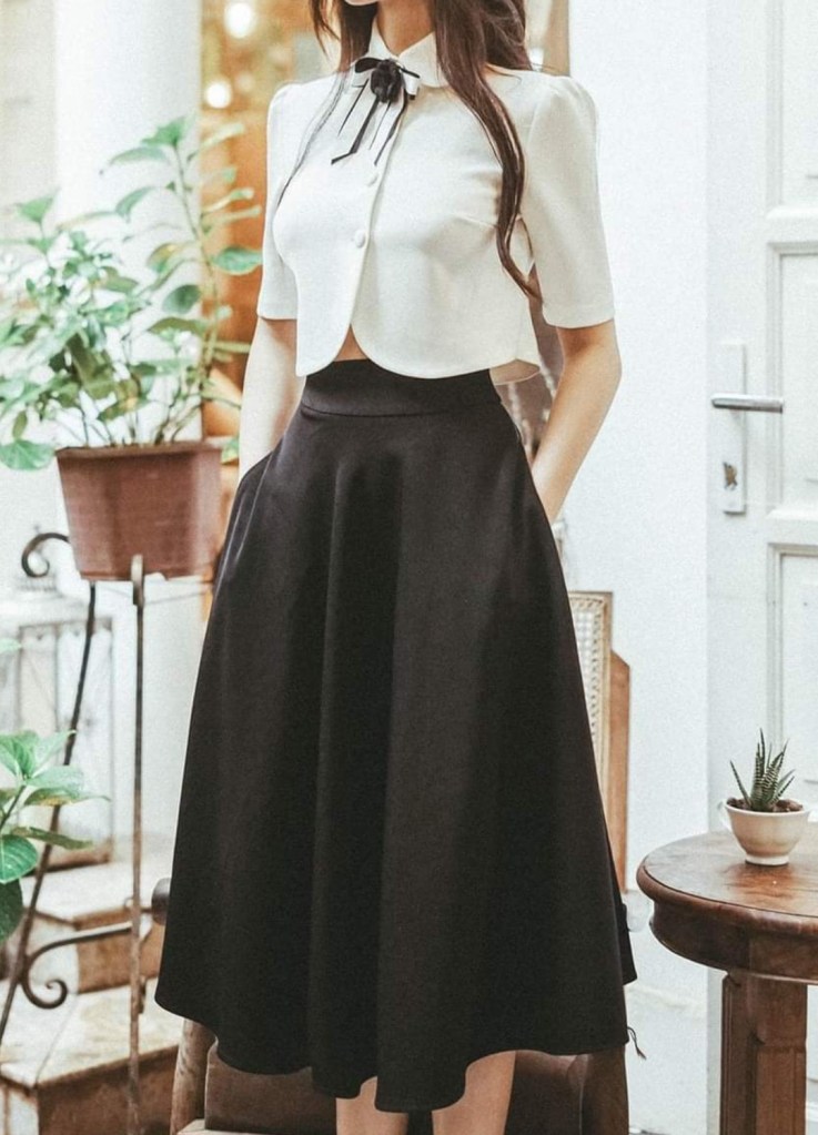 Chân váy quả bí là dáng váy phồng ở trên, cúp lại ở dưới và có độ dài trên gối. Tùy thuộc vào chất liệu mà bạn có thể diện chúng đến những sự kiện trang trọng hay mặc trang phục thường ngày. Kiểu váy này giúp nổi bật vòng eo và phù hợp với hầu hết mọi vóc dáng.